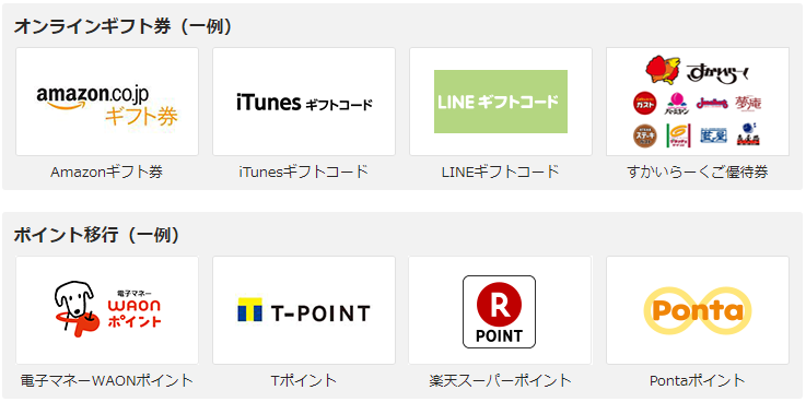 ためたオリコポイントは、オリコポイントゲートウェイで1オリコポイント=1円相当として500オリコポイントから、様々なギフト券やポイントと交換できます。Amazonギフト券、iTunesギフトコードなど、リアルタイムで交換できる商品もたくさんあります。